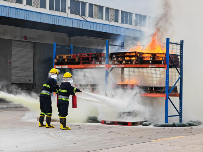 库内火灾模拟演练现场,三层货架被熊熊大火包围,安保人员听到消防警报后,及时启动园区微型消防车进行灭火。随着火势增大,安保人员又迅速连接消防栓和水带,手持水枪进行灭火。参加演习的消防队员也开动消防车参与到灭火行动,不到1分钟,火势迅速被扑灭。