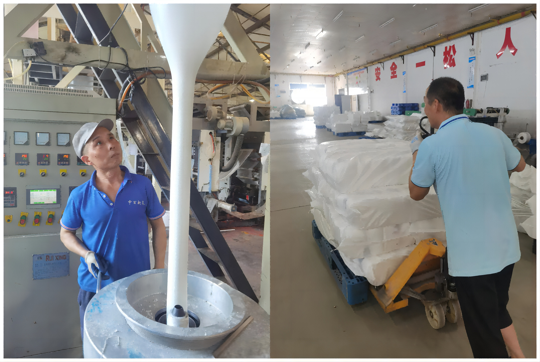 在吹塑车间制袋组,女工们坚守岗位,奋力扛起生产加工“半边天”。将一卷卷60公斤重的膜卷搬运到机台上,她们满是汗珠的脸上,透露着奋斗的光芒。工作服湿了又干,干了又湿,但没有人放慢手中的节奏。上料、穿料、卷带、贴标、包装……一气呵成。