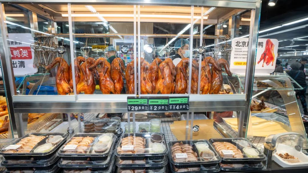 门店现场,烟火气满满,秋冬季特色商品尤为丰富。在生鲜食品区,新增的热菜加工系列尤为引人注目。刘老大卤蹄髈、宴海毛嘴卤鸡等经典卤味,香气扑鼻,让人垂涎欲滴。除了热菜加工系列,本土传统三炸系列也迎来了新变化。现制的夫妻肺片、手撕鸡等经典小吃,以其地道的风味和独特的口感,吸引了众多消费者的目光。